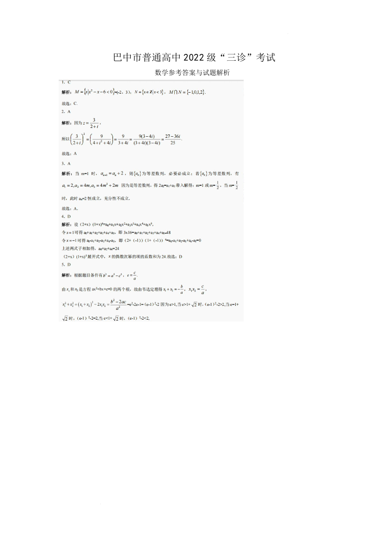 巴中市普通高中2022级三诊 数学参考答案.docx
