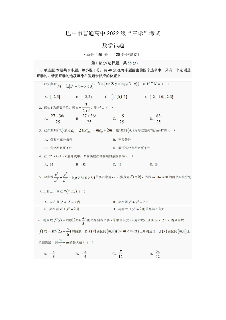 巴中市普通高中2022级三诊 数学.docx