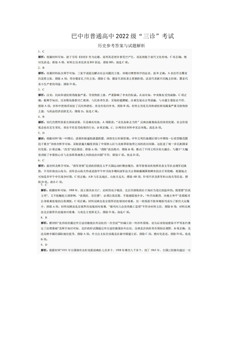 巴中市普通高中2022级三诊 历史参考答案.docx