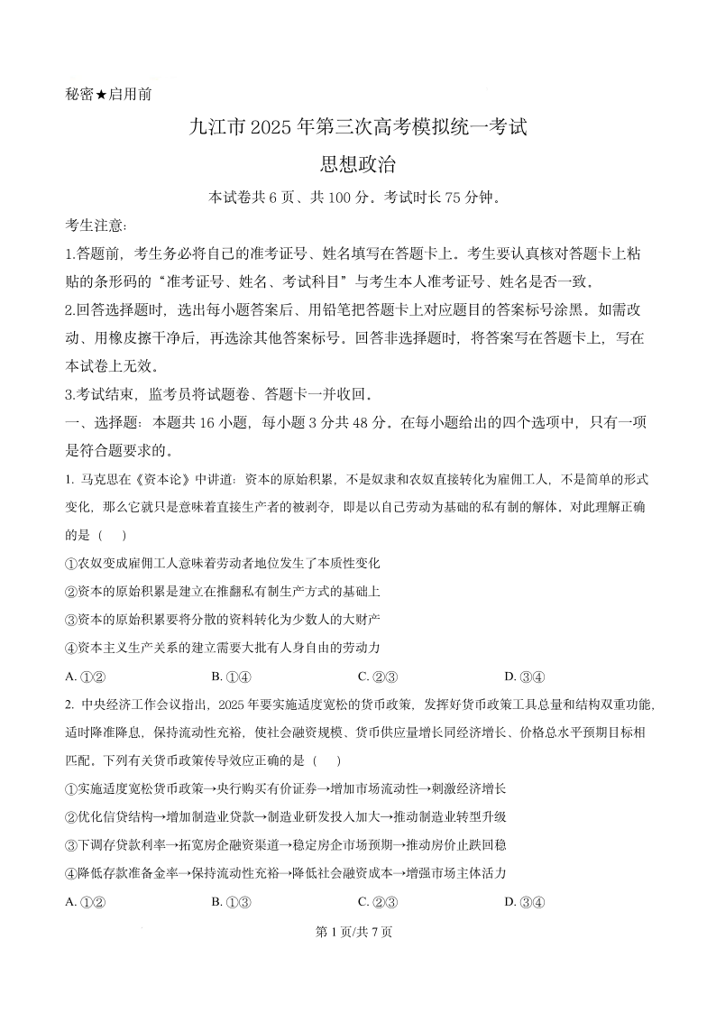 江西省九江市2025届高三第三次高考模拟统一考试 政治.pdf