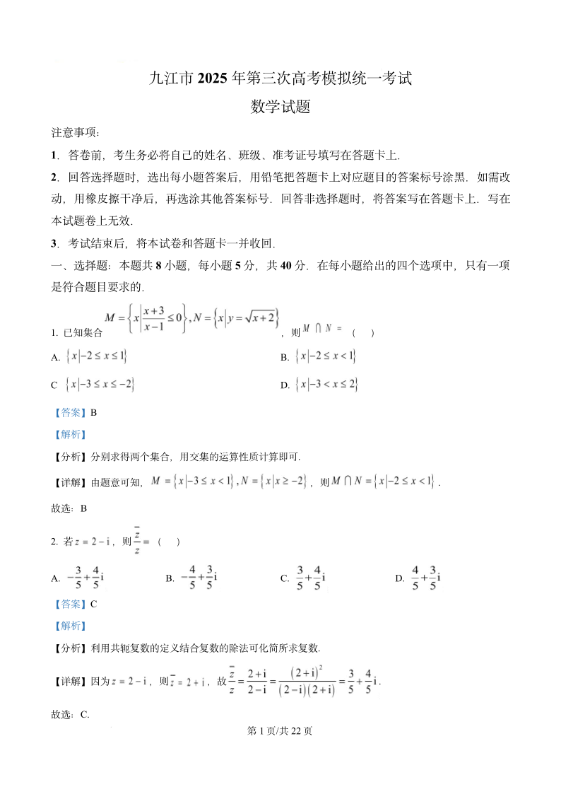 江西省九江市2025届高三第三次高考模拟统一考试 数学答案.pdf
