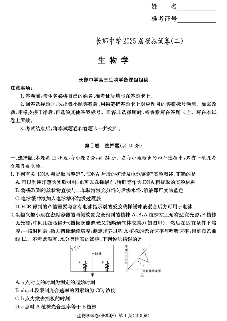 湖南省长郡中学2025届高三模拟试卷(二)生物(含答案).pdf