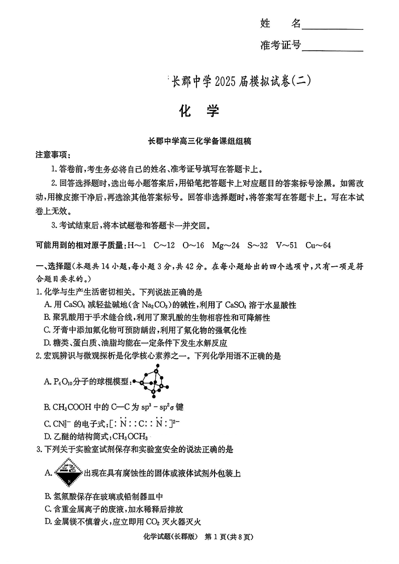 湖南省长郡中学2025届高三模拟试卷(二)化学(含答案).pdf