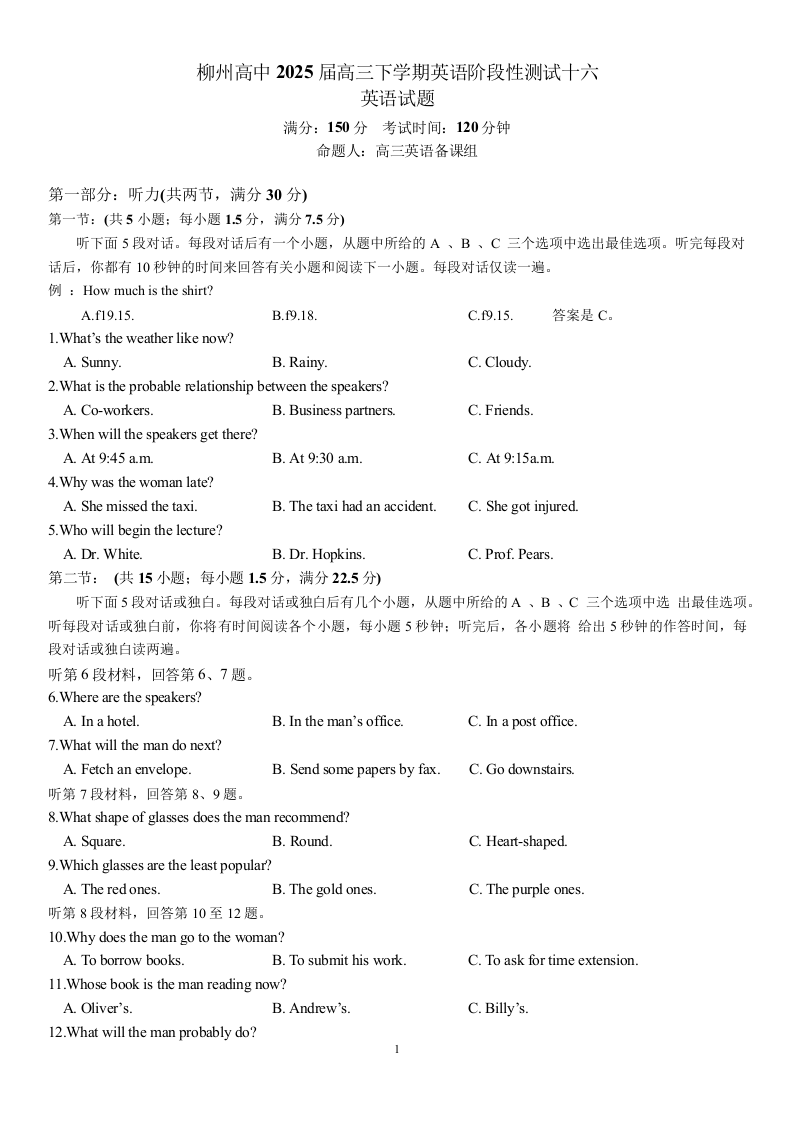 柳州高级中学2025届高三下学期第十六次阶段性测试 英语.docx