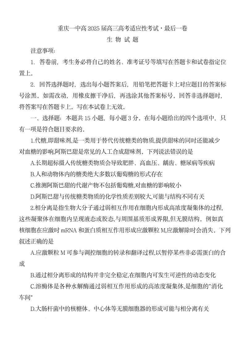 重庆一中高2025届高考适应性考试最后一卷 生物(含答案).pdf