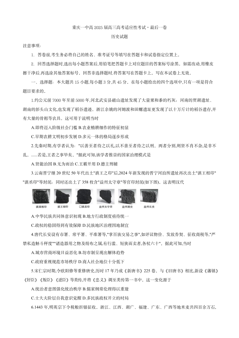 重庆一中高2025届高考适应性考试最后一卷 历史(含答案).pdf