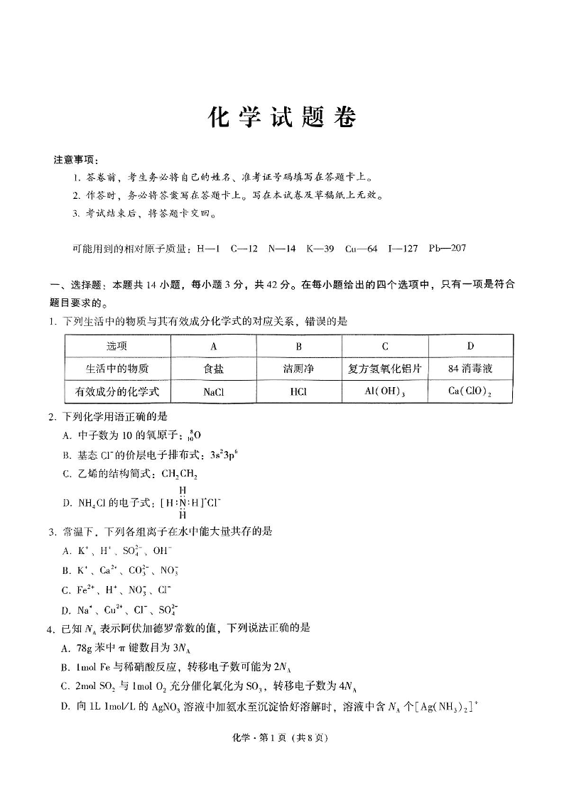 重庆一中高2025届高考适应性考试最后一卷 化学.pdf