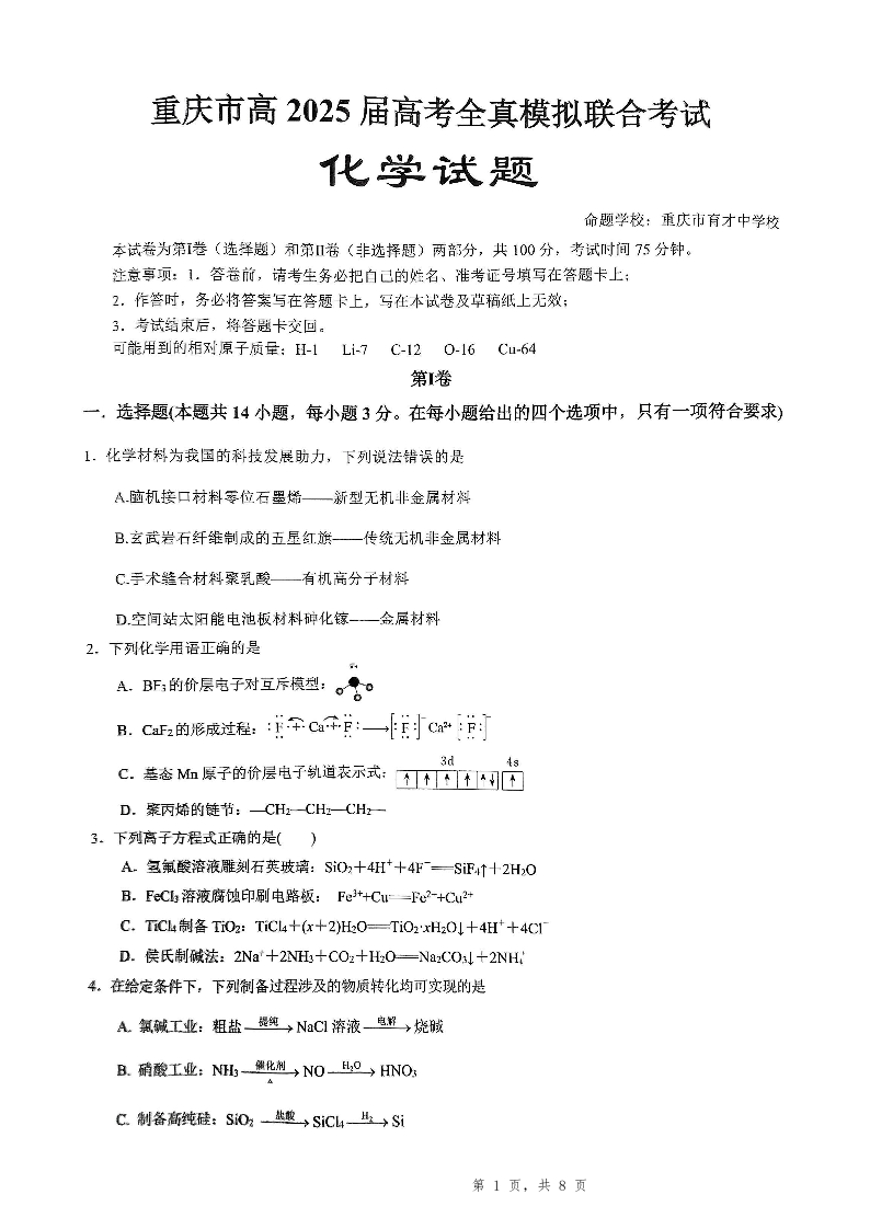 重庆育才中学全真模拟 化学.pdf