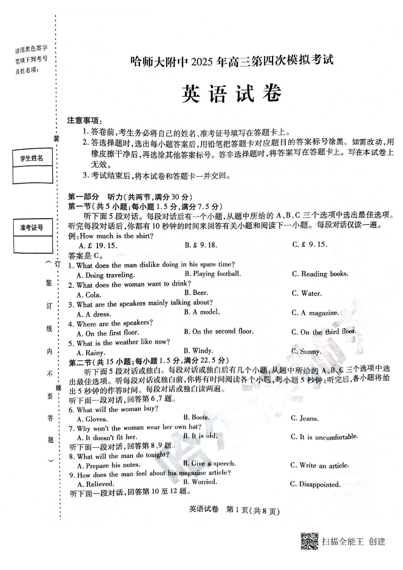 哈师大附中2025年高三第四次模拟考试 英语(含答案).pdf
