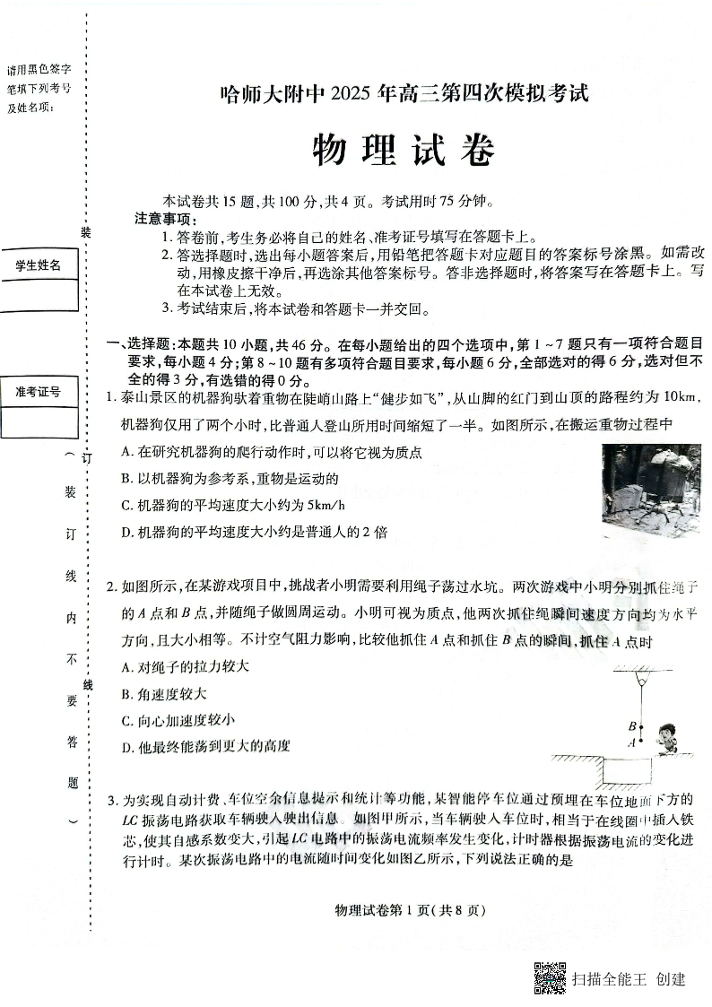 哈师大附中2025年高三第四次模拟考试 物理.pdf