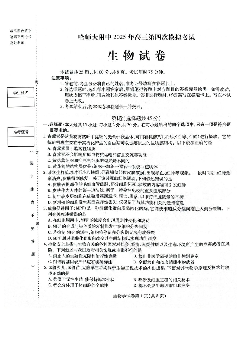 哈师大附中2025年高三第四次模拟考试 生物(含答案).pdf