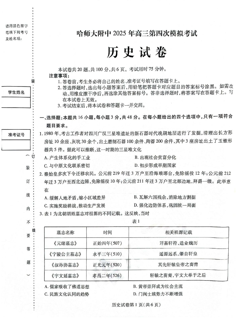 哈师大附中2025年高三第四次模拟考试 历史.pdf