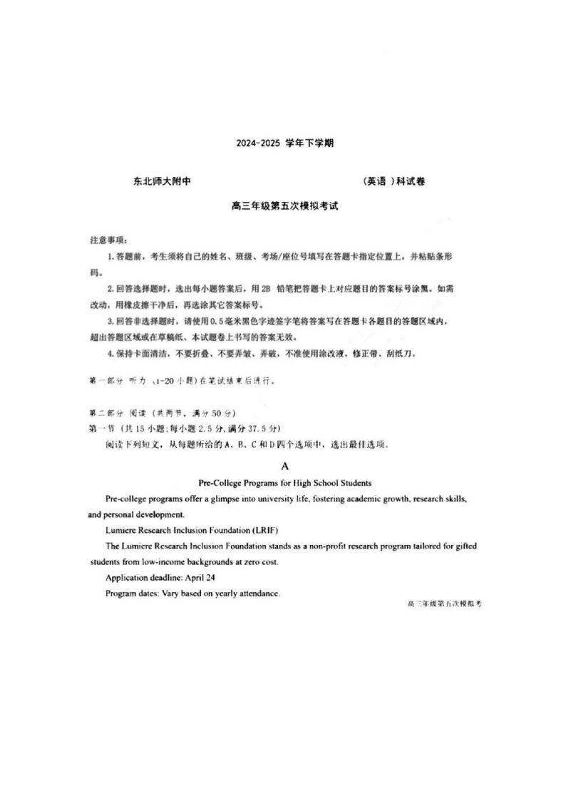 东北师大附中2025届高三年级第五次模拟考试 英语试题(含答案).pdf
