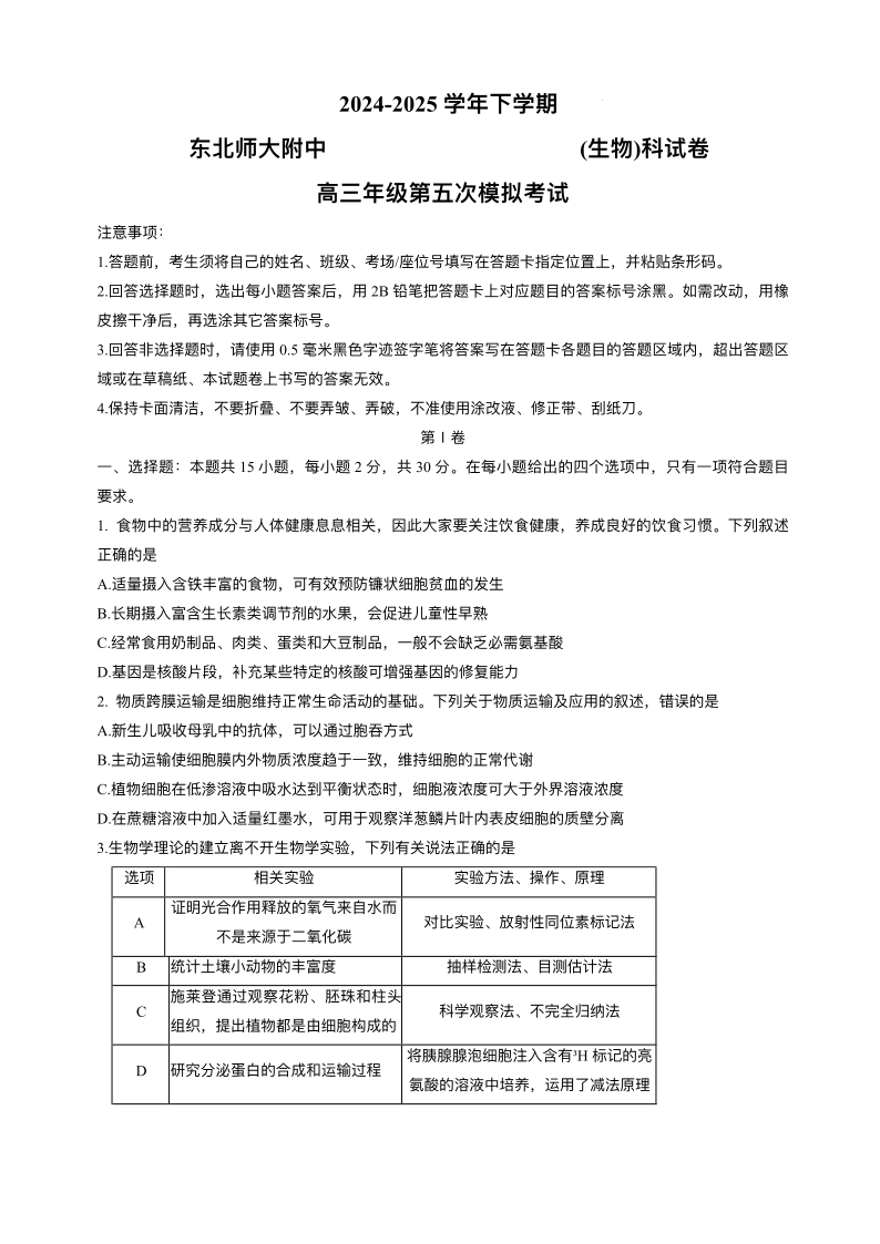 东北师大附中2025届高三年级第五次模拟考试 生物试题(含答案).pdf