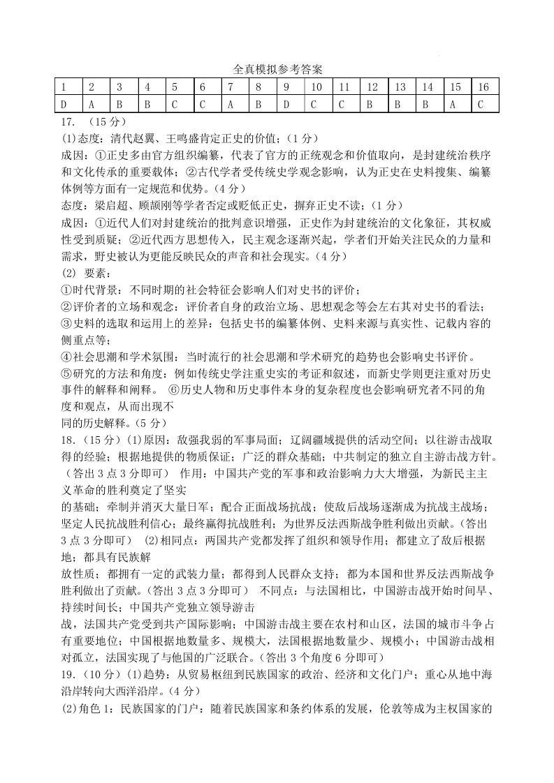 河南省实验中学2025届高三下学期全真模拟 历史答案.docx