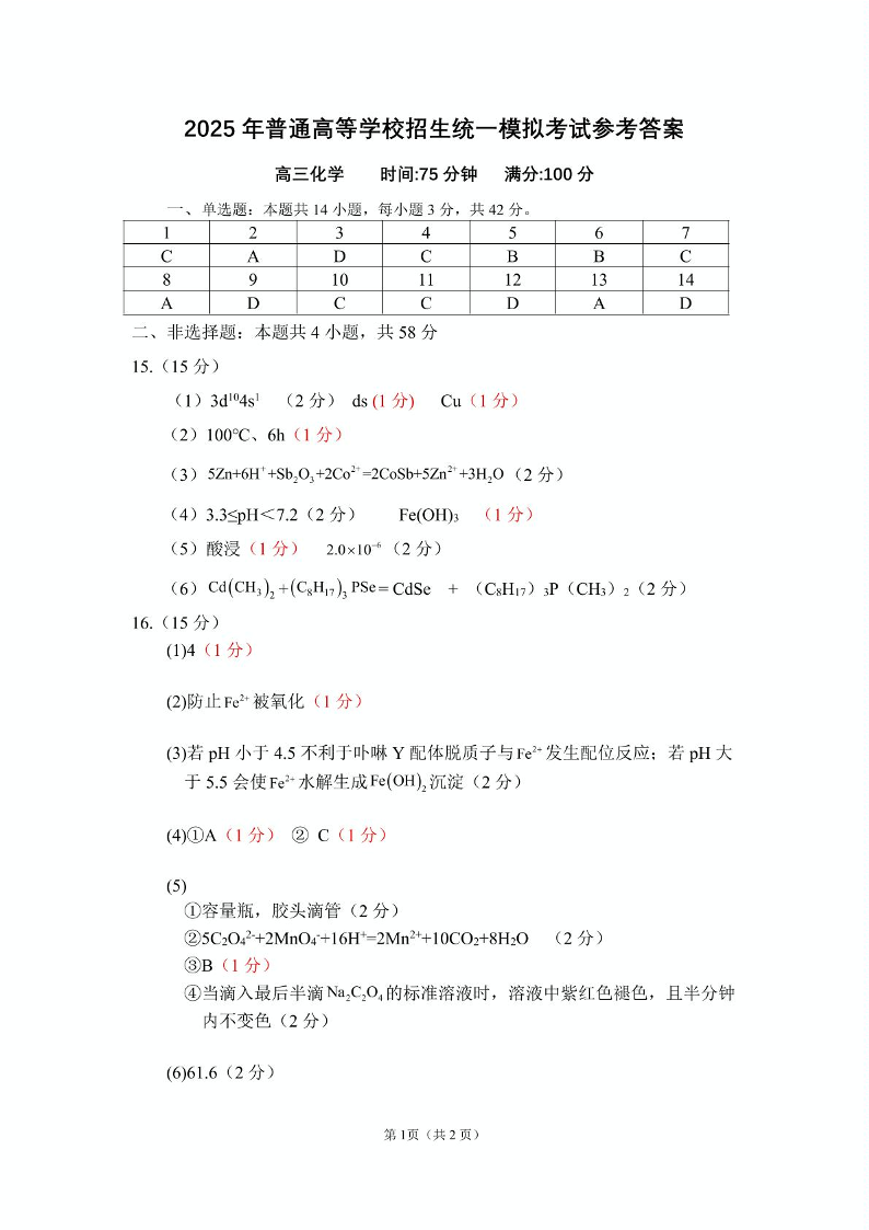 河南省实验中学2025届高三下学期全真模拟 化学答案.pdf