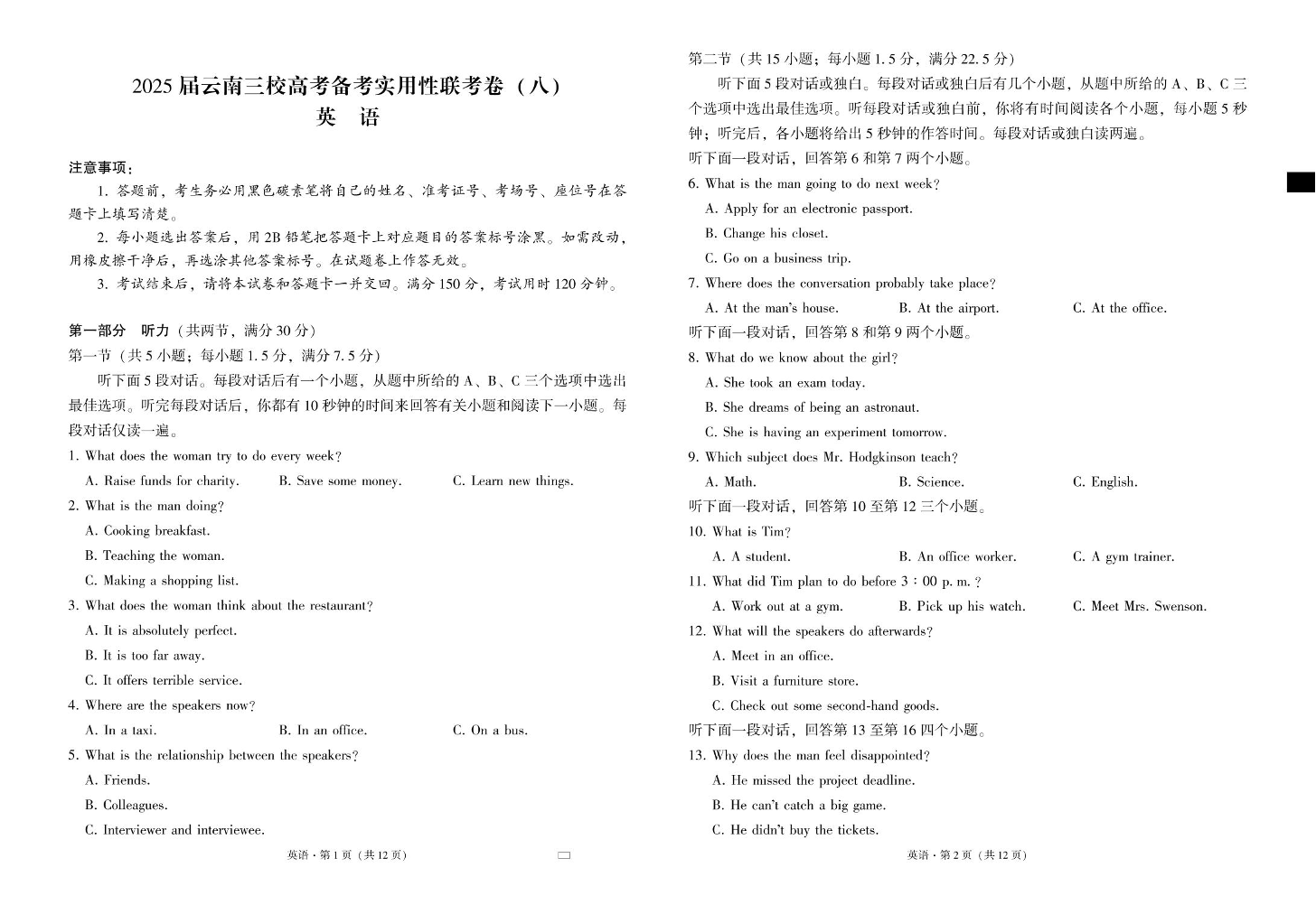 云南省三校2025届高三下学期高考备考实用性联考(八)英语试卷(含解析).pdf