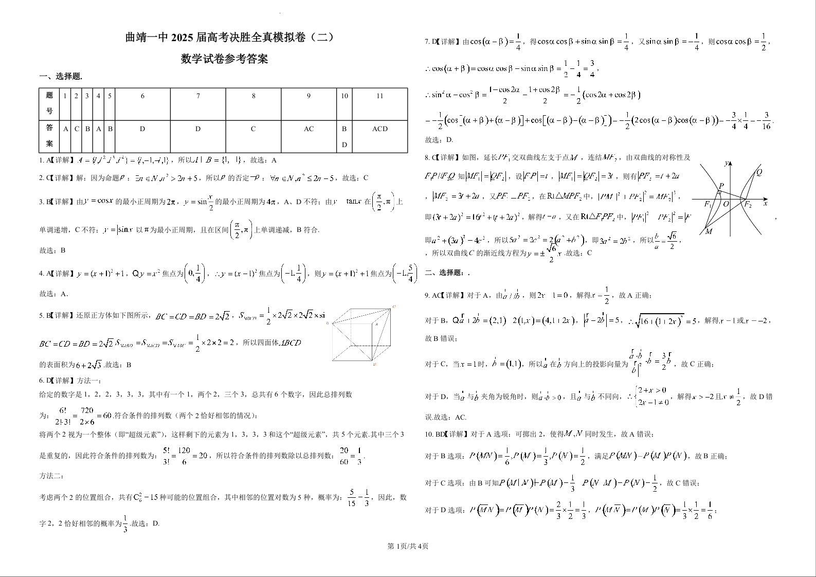 曲靖一中2025届高考决胜全真模拟卷(二)数学答案.docx