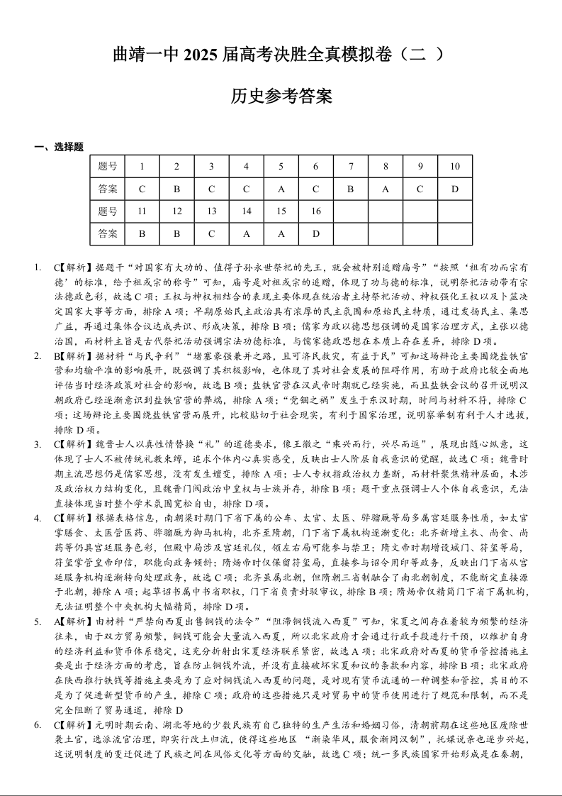 曲靖一中2025届高考决胜全真模拟卷(二)历史答案.docx