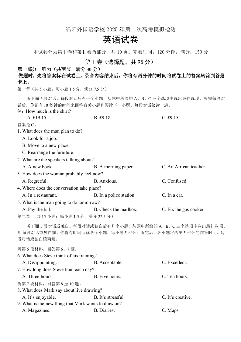 四川省绵阳外国语学校2025届高三第二次模拟考试 英语(含答案).docx