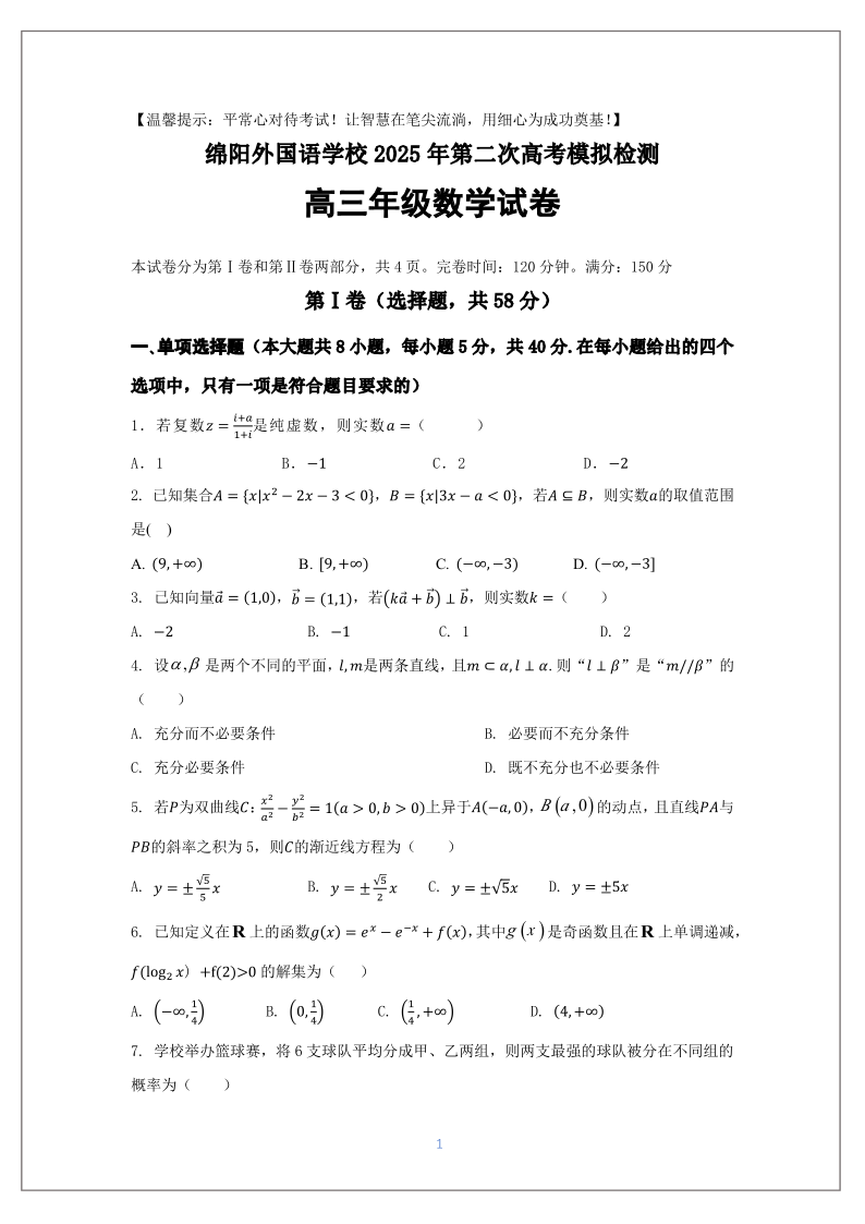 四川省绵阳外国语学校2025届高三第二次模拟考试 数学(含答案).pdf