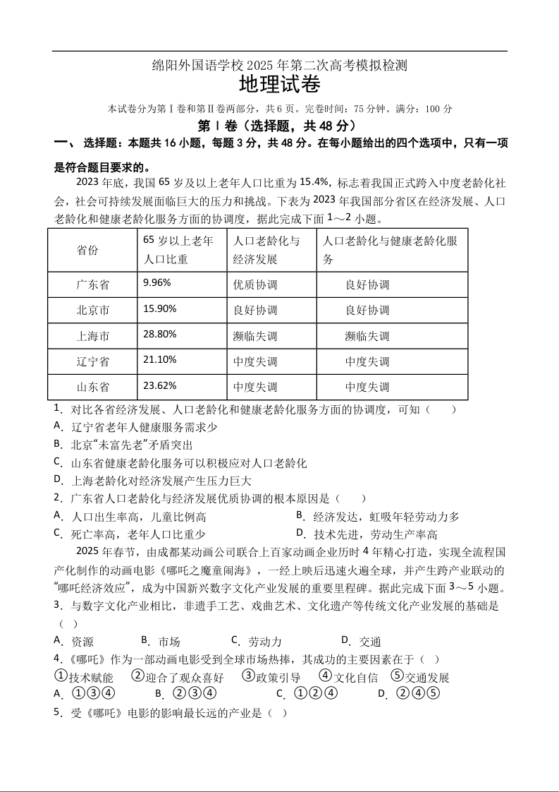 四川省绵阳外国语学校2025届高三第二次模拟考试 地理(含答案).docx
