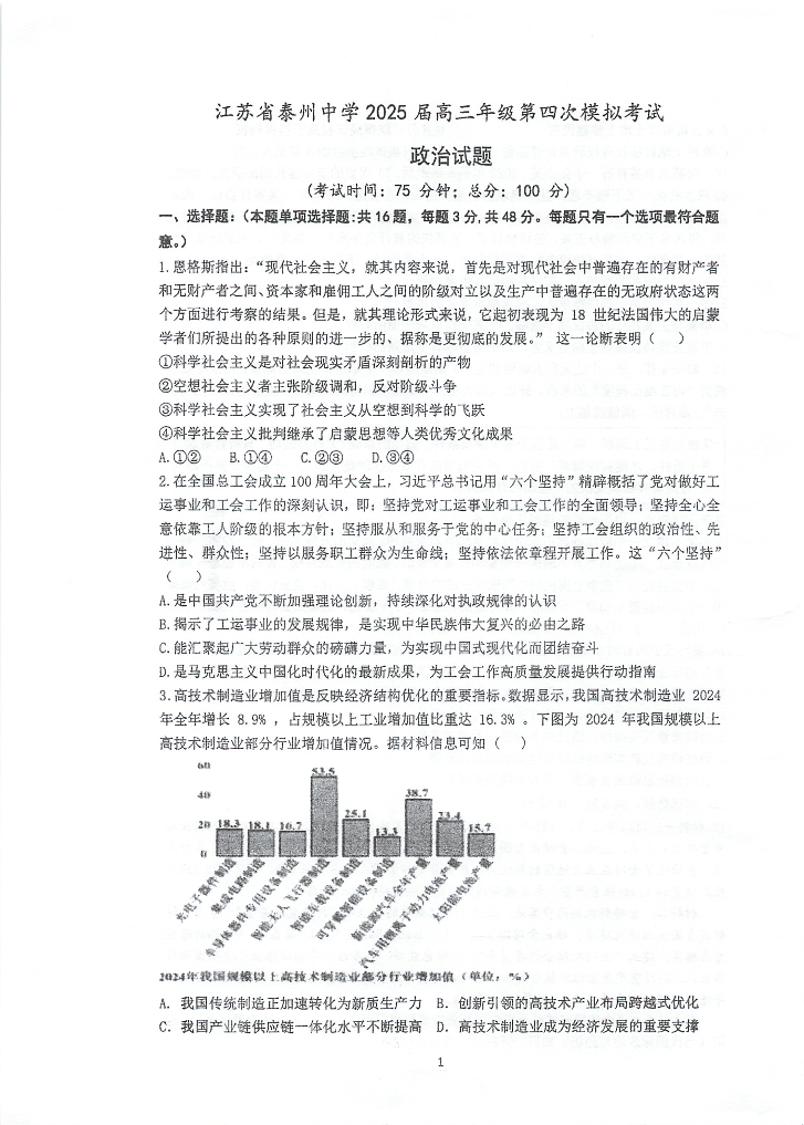 江苏省泰州中学2025届高三年级第四次模拟考试 政治(含答案).pdf