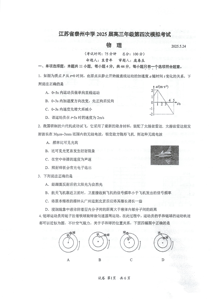 江苏省泰州中学2025届高三年级第四次模拟考试 物理(含答案).pdf