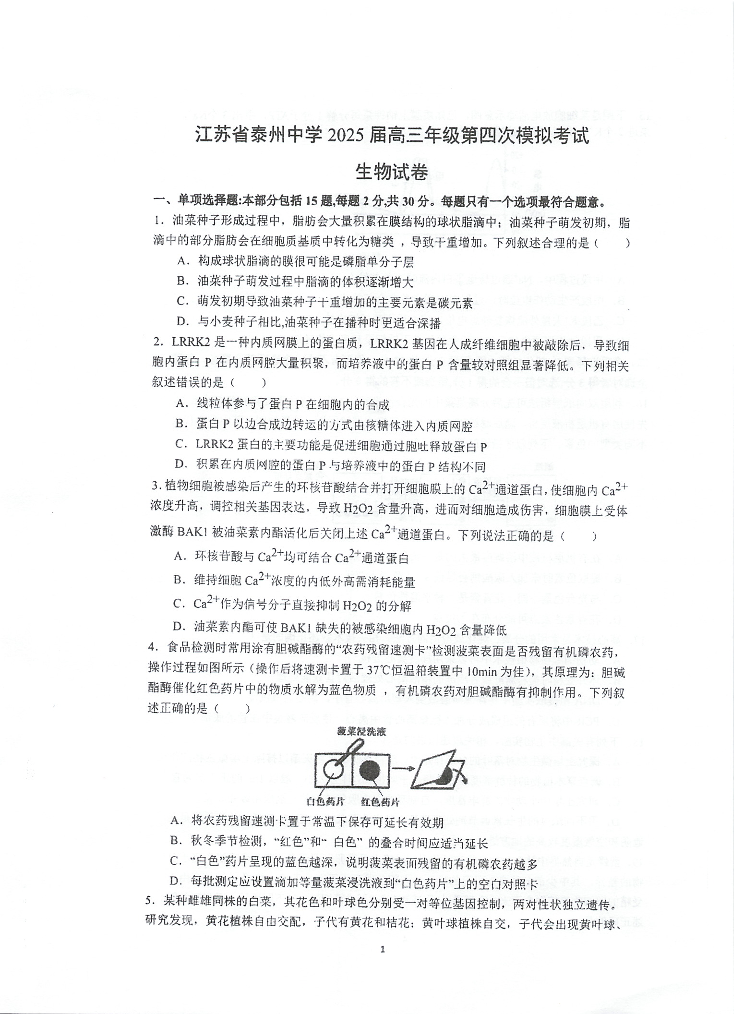 江苏省泰州中学2025届高三年级第四次模拟考试 生物(含答案).pdf