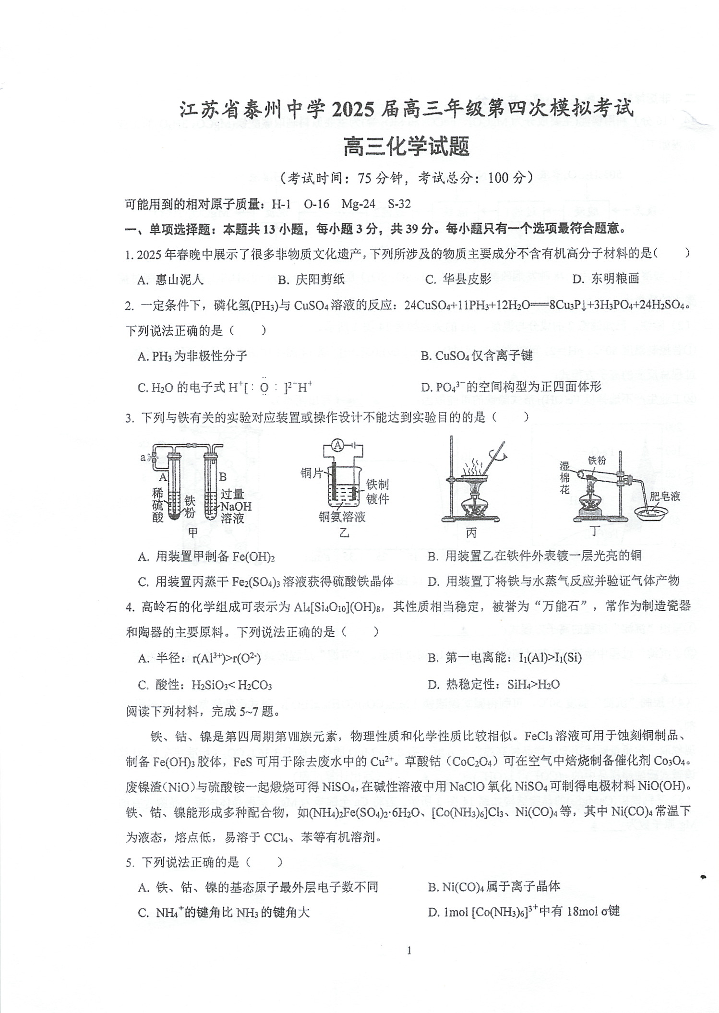 江苏省泰州中学2025届高三年级第四次模拟考试 化学(含答案).pdf