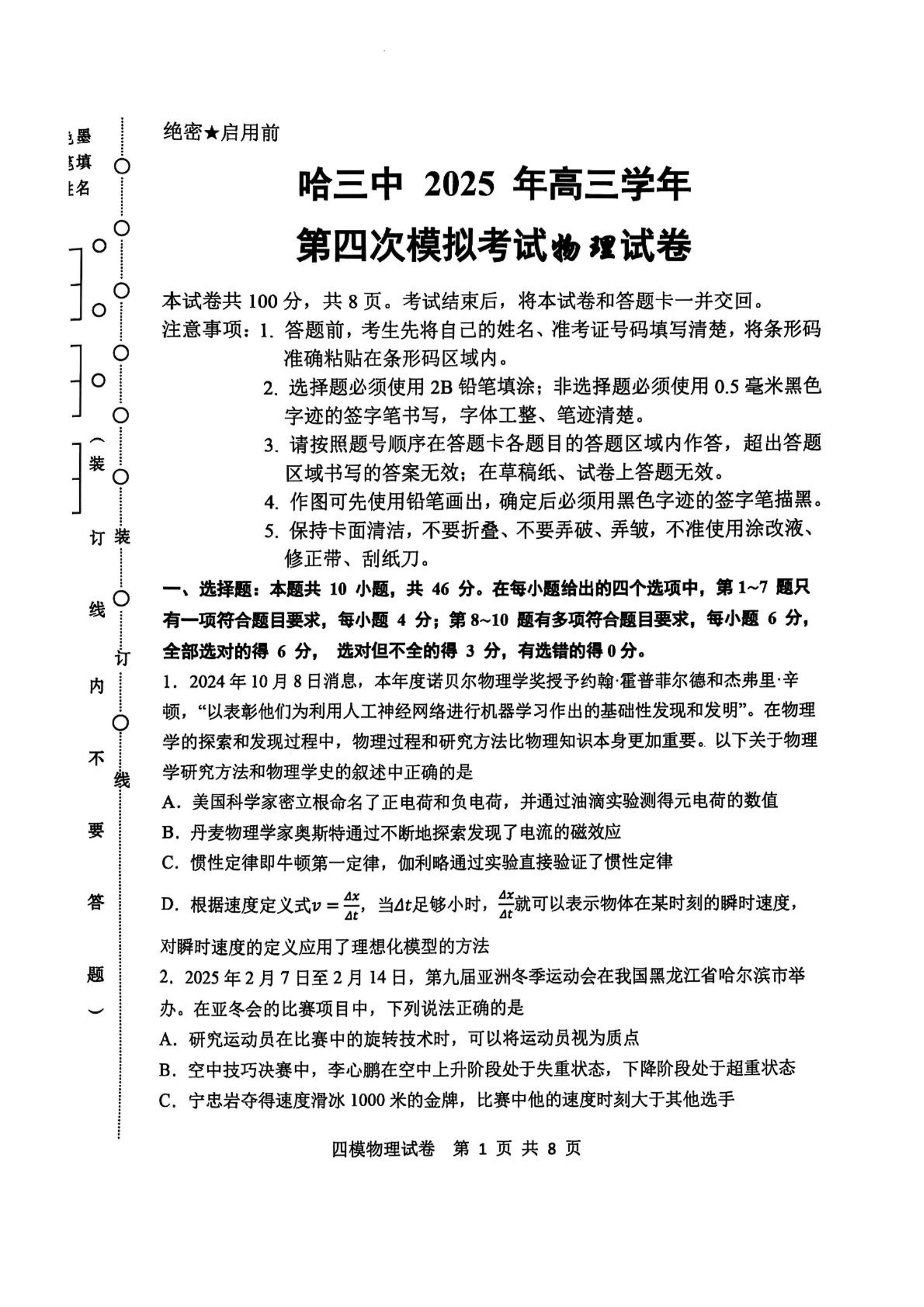 黑龙江省哈尔滨市第三中学校2025届高三第四次模拟考试 物理.pdf