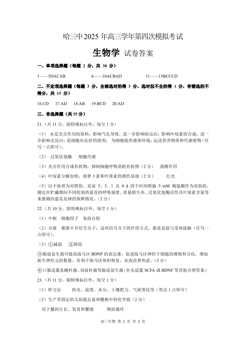 黑龙江省哈尔滨市第三中学校2025届高三第四次模拟考试 生物答案.pdf