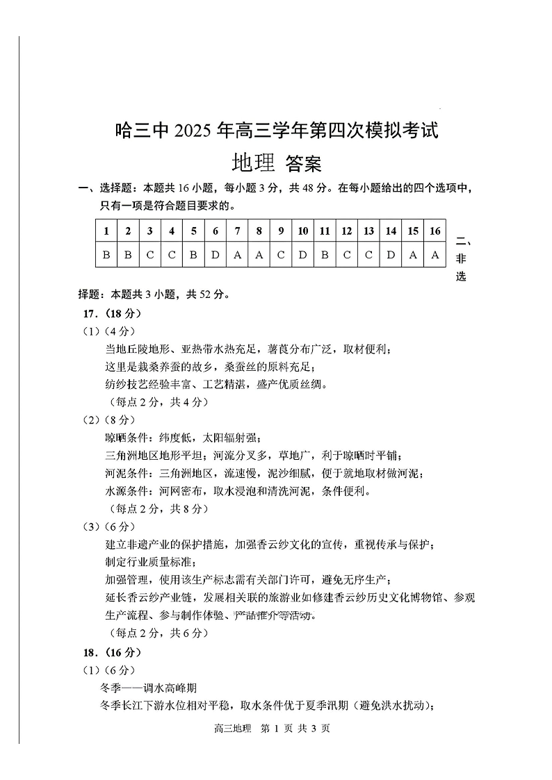 黑龙江省哈尔滨市第三中学校2025届高三第四次模拟考试 地理答案.pdf