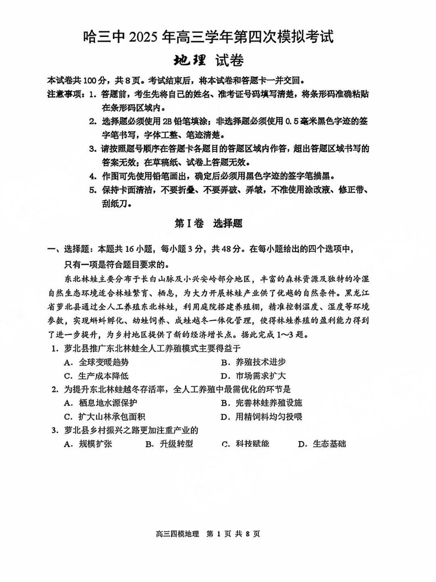 黑龙江省哈尔滨市第三中学校2025届高三第四次模拟考试 地理.pdf