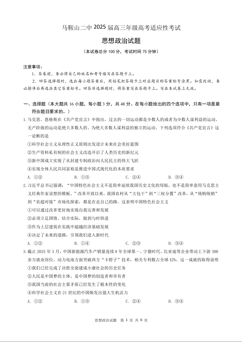 马鞍山二中2025届高三年级高考适应性考试 政治.docx