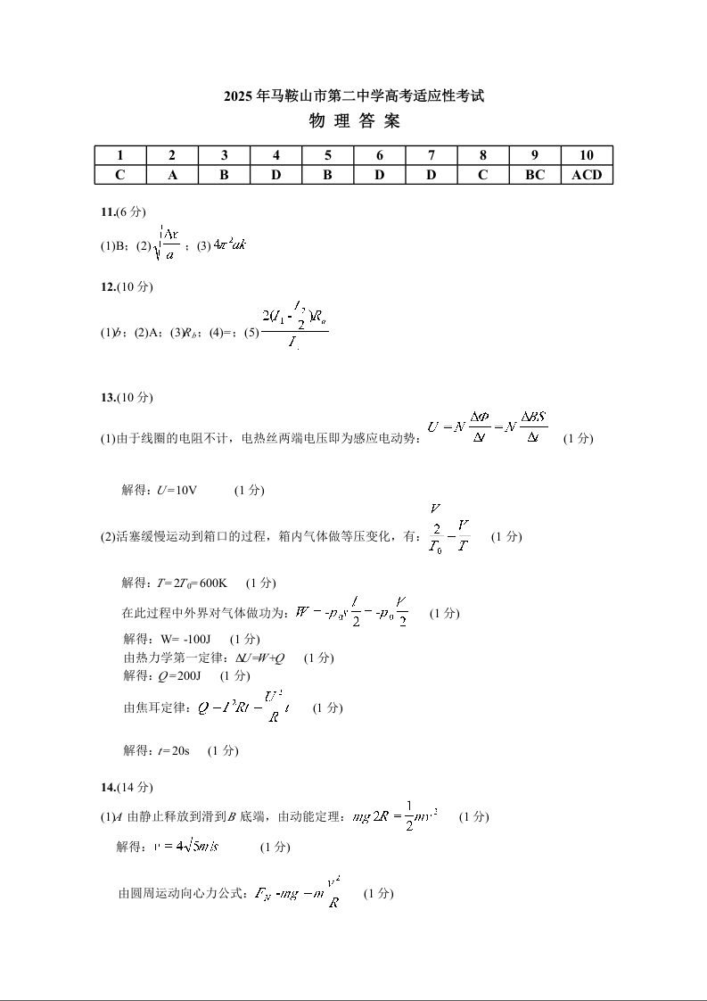 马鞍山二中2025届高三年级高考适应性考试 物理答案.docx
