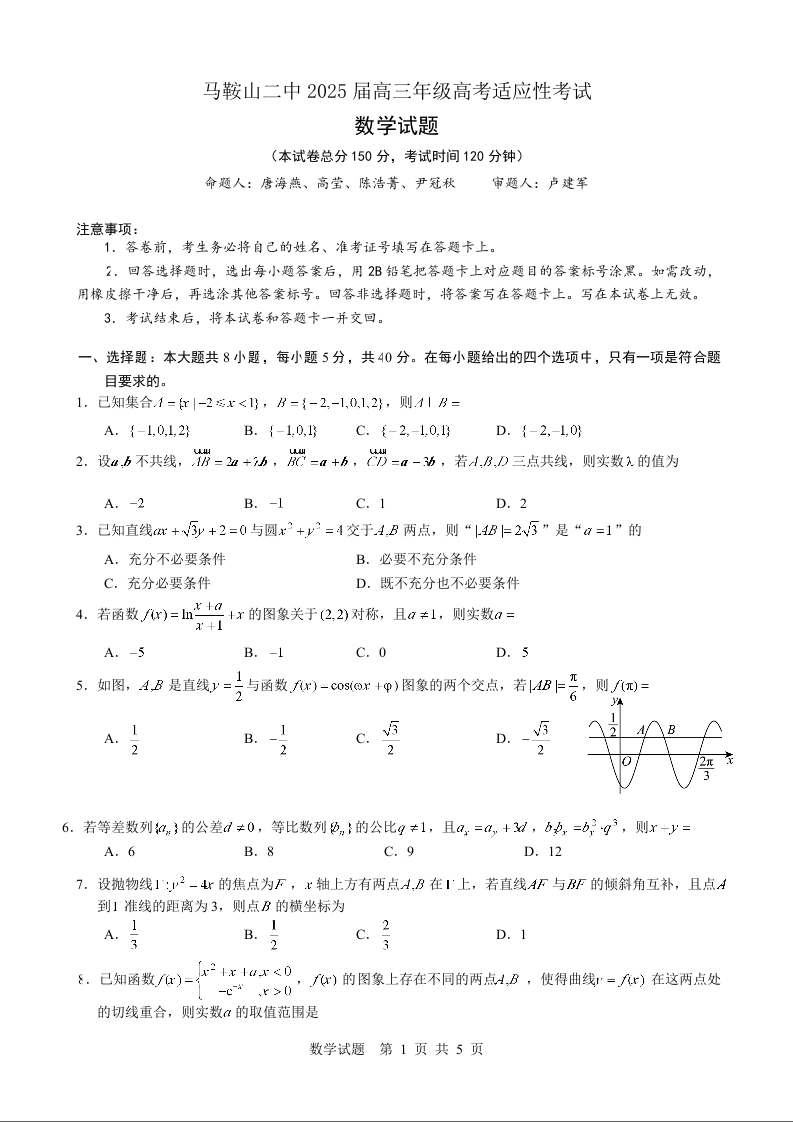 马鞍山二中2025届高三年级高考适应性考试 数学.doc