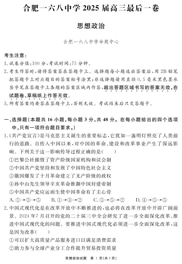 安徽省合肥一六八中学2025届高三最后一卷 政治.pdf