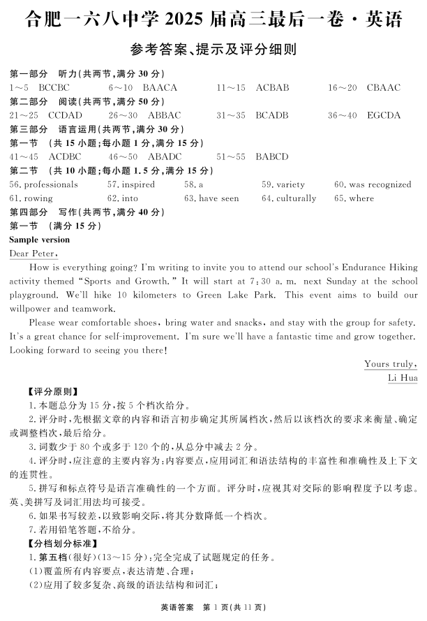 安徽省合肥一六八中学2025届高三最后一卷 英语答案.pdf