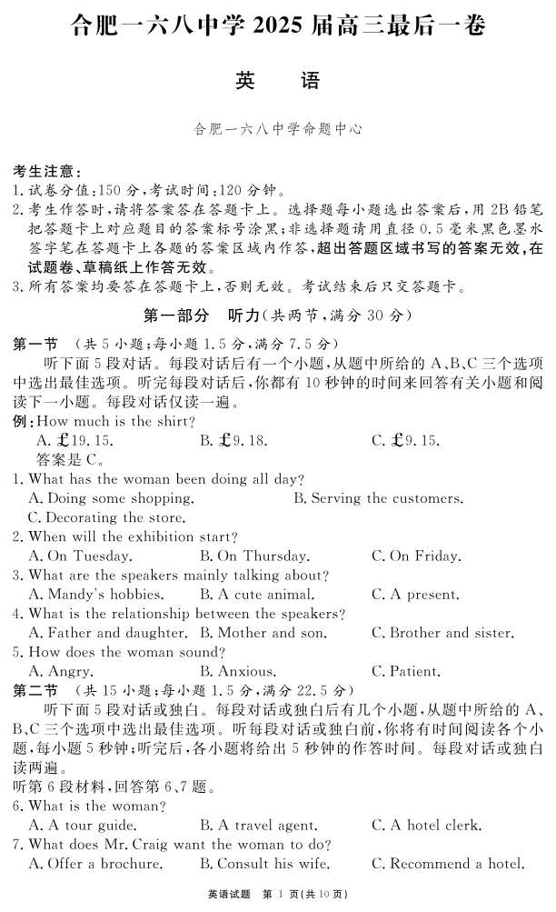 安徽省合肥一六八中学2025届高三最后一卷 英语.pdf