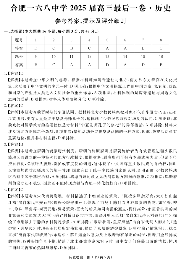 安徽省合肥一六八中学2025届高三最后一卷 历史答案.pdf