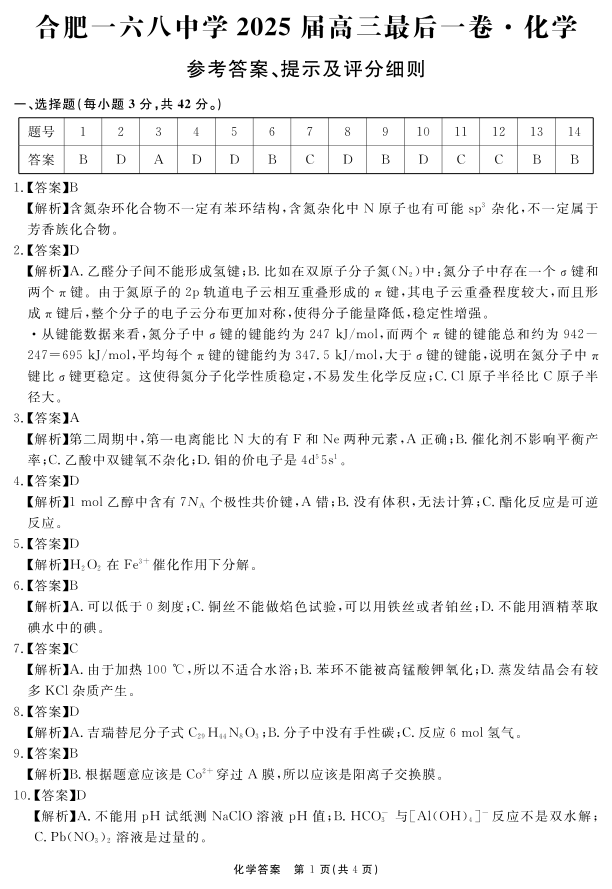 安徽省合肥一六八中学2025届高三最后一卷 化学答案.pdf