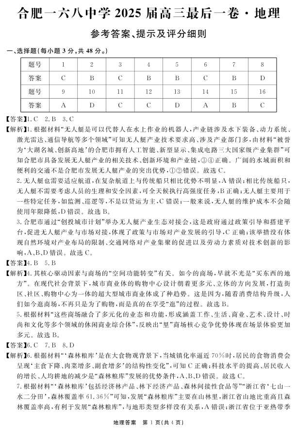 安徽省合肥一六八中学2025届高三最后一卷 地理答案.pdf