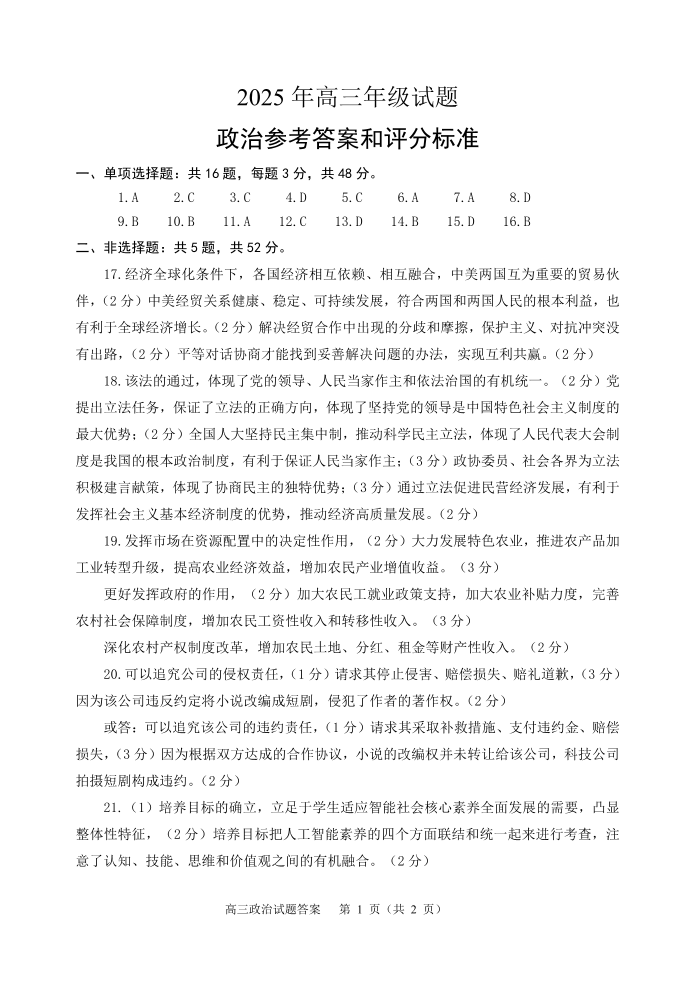江苏省徐州市2025届高三下学期5月考前打靶 政治答案.pdf