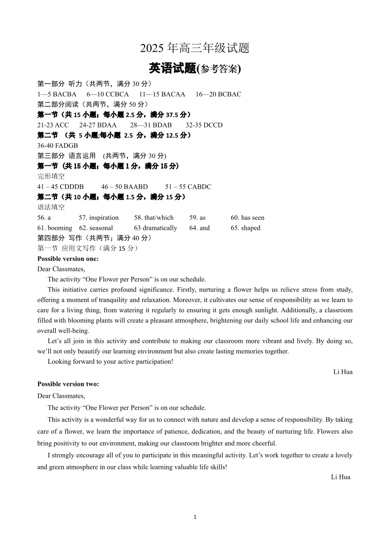 江苏省徐州市2025届高三下学期5月考前打靶 英语答案.pdf