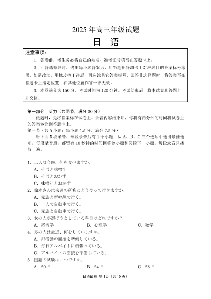江苏省徐州市2025届高三下学期5月考前打靶 日语.pdf