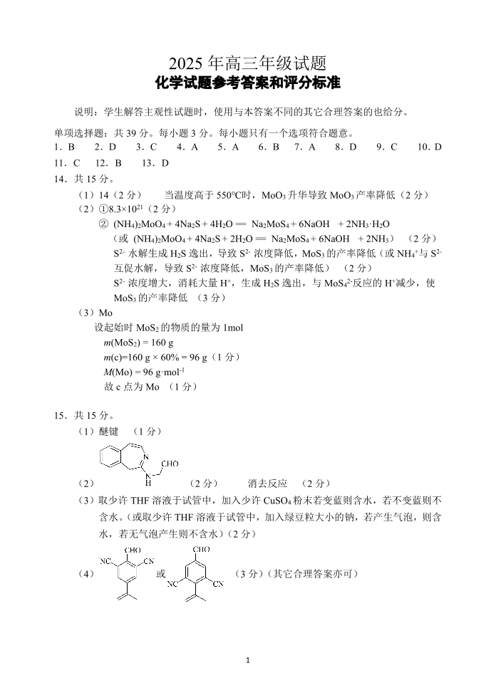 江苏省徐州市2025届高三下学期5月考前打靶 化学答案.pdf