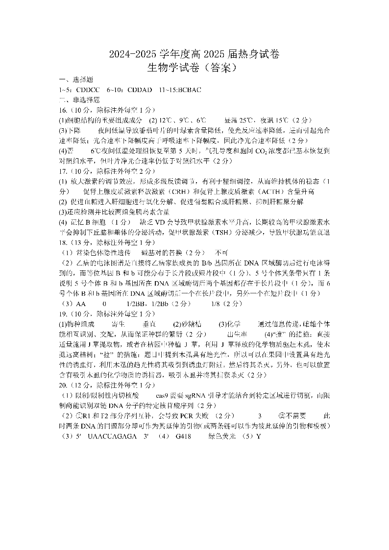 成都市第七中学2024~2025学年度下期高2025届高考热身考试 生物答案.pdf