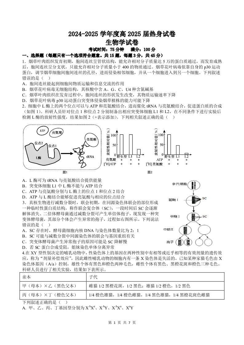 成都市第七中学2024~2025学年度下期高2025届高考热身考试 生物.pdf