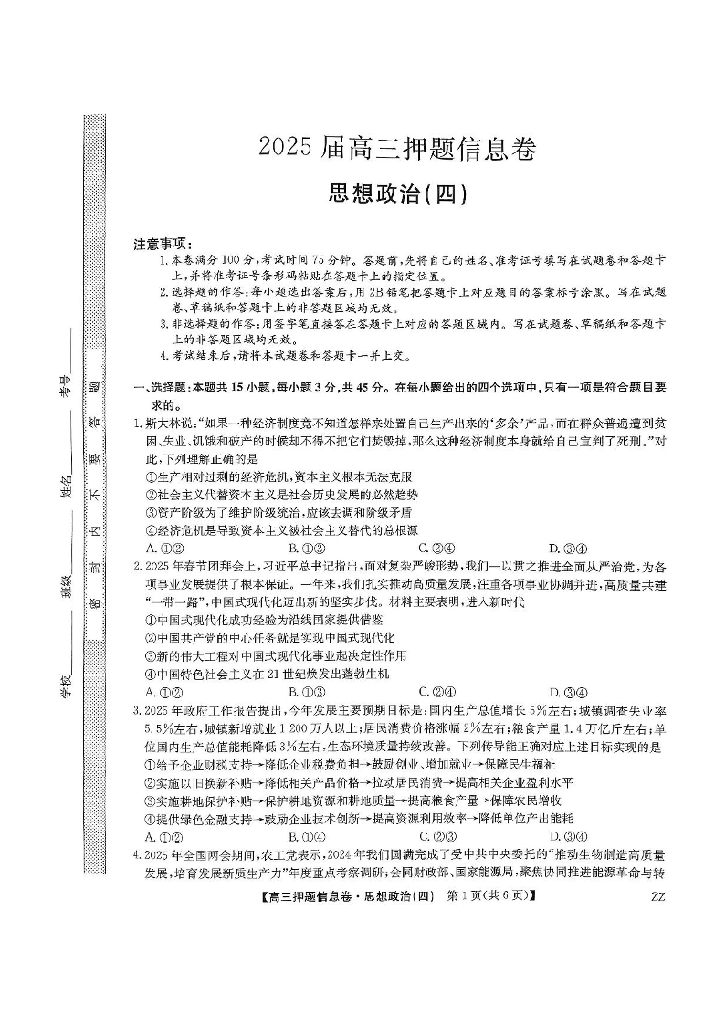九师联盟2025届高三押题信息卷(四)政治试卷(含答案).pdf